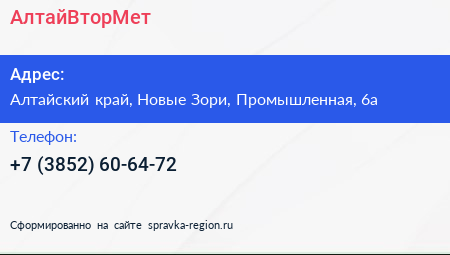 АлтайВторМет по адресу Алтайский край, Новые Зори, Промышленная, 6а в дальнейшем Организация, размещена в следующих категориях: