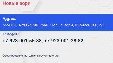 Новые зори по адресу 659010, Алтайский край, Новые Зори, Юбилейная, 2/1 в дальнейшем Организация, размещена в следующих категориях: