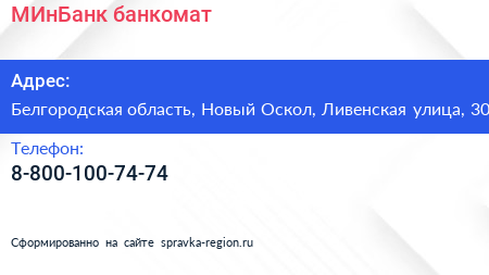 МИнБанк, банкомат по адресу Белгородская область, Новый Оскол, Ливенская улица, 30 в дальнейшем Организация, размещена в следующих категориях: