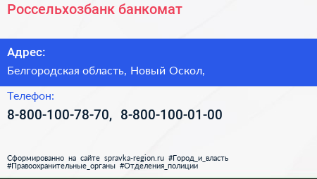 Россельхозбанк, банкомат по адресу Белгородская область, Новый Оскол, в дальнейшем Организация, размещена в следующих категориях: