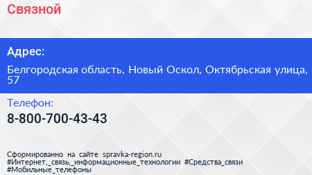 Связной по адресу Белгородская область, Новый Оскол, Октябрьская улица, 57 в дальнейшем Организация, размещена в следующих категориях: