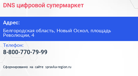 DNS, цифровой супермаркет по адресу Белгородская область, Новый Оскол, площадь Революции, 4 в дальнейшем Организация, размещена в следующих категориях: