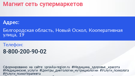Магнит, сеть супермаркетов по адресу Белгородская область, Новый Оскол, Кооперативная улица, 19 в дальнейшем Организация, размещена в следующих категориях:
