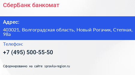 СберБанк, банкомат по адресу 403021, Волгоградская область, Новый Рогачик, Степная, 98а в дальнейшем Организация, размещена в следующих категориях: