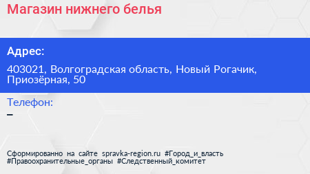 Магазин нижнего белья по адресу 403021, Волгоградская область, Новый Рогачик, Приозёрная, 50 в дальнейшем Организация, размещена в следующих категориях: