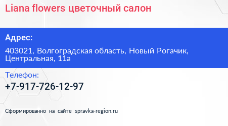 Liana-flowers, цветочный салон по адресу 403021, Волгоградская область, Новый Рогачик, Центральная, 11а в дальнейшем Организация, размещена в следующих категориях: