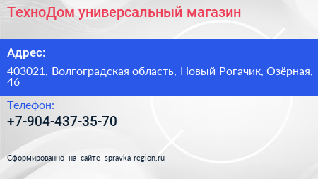 ТехноДом, универсальный магазин по адресу 403021, Волгоградская область, Новый Рогачик, Озёрная, 46 в дальнейшем Организация, размещена в следующих категориях: