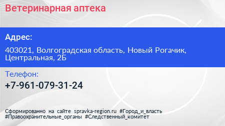 Ветеринарная аптека по адресу 403021, Волгоградская область, Новый Рогачик, Центральная, 2Б в дальнейшем Организация, размещена в следующих категориях: