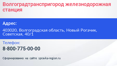 Волгоградтранспригород, железнодорожная станция по адресу 403020, Волгоградская область, Новый Рогачик, Советская, 40/1 в дальнейшем Организация, размещена в следующих категориях:
