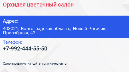 Орхидея, цветочный салон по адресу 403021, Волгоградская область, Новый Рогачик, Приозёрная, 43 в дальнейшем Организация, размещена в следующих категориях: