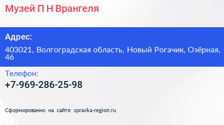 Музей П.Н. Врангеля по адресу 403021, Волгоградская область, Новый Рогачик, Озёрная, 46 в дальнейшем Организация, размещена в следующих категориях: