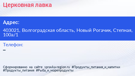 Церковная лавка по адресу 403021, Волгоградская область, Новый Рогачик, Степная, 100а/1 в дальнейшем Организация, размещена в следующих категориях: