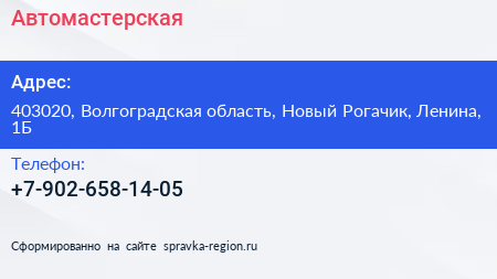 Автомастерская по адресу 403020, Волгоградская область, Новый Рогачик, Ленина, 1Б в дальнейшем Организация, размещена в следующих категориях: