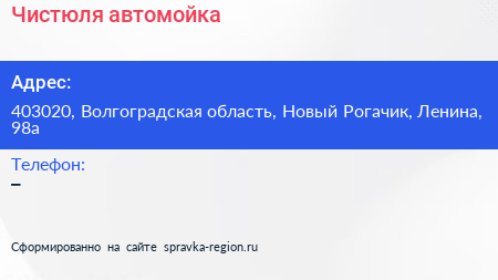 Чистюля, автомойка по адресу 403020, Волгоградская область, Новый Рогачик, Ленина, 98а в дальнейшем Организация, размещена в следующих категориях: