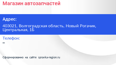 Магазин автозапчастей по адресу 403021, Волгоградская область, Новый Рогачик, Центральная, 1Б в дальнейшем Организация, размещена в следующих категориях: