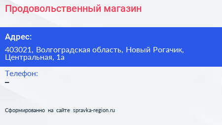 Продовольственный магазин по адресу 403021, Волгоградская область, Новый Рогачик, Центральная, 1а в дальнейшем Организация, размещена в следующих категориях: