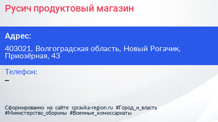 Русич, продуктовый магазин по адресу 403021, Волгоградская область, Новый Рогачик, Приозёрная, 43 в дальнейшем Организация, размещена в следующих категориях: