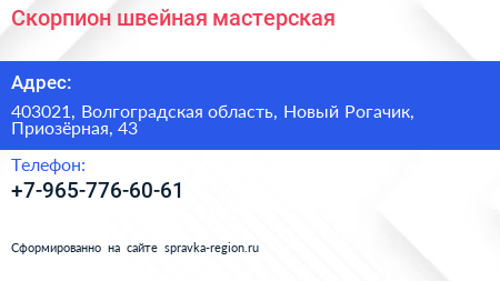 Скорпион, швейная мастерская по адресу 403021, Волгоградская область, Новый Рогачик, Приозёрная, 43 в дальнейшем Организация, размещена в следующих категориях: