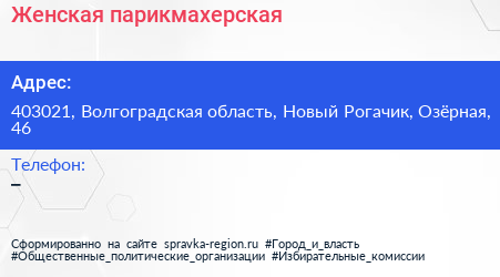 Женская парикмахерская по адресу 403021, Волгоградская область, Новый Рогачик, Озёрная, 46 в дальнейшем Организация, размещена в следующих категориях: