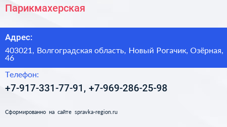 Парикмахерская по адресу 403021, Волгоградская область, Новый Рогачик, Озёрная, 46 в дальнейшем Организация, размещена в следующих категориях: