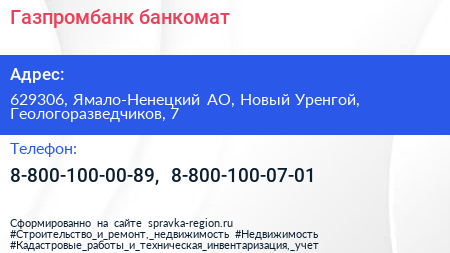 Газпромбанк, банкомат по адресу 629306, Ямало-Ненецкий АО, Новый Уренгой, Геологоразведчиков, 7 в дальнейшем Организация, размещена в следующих категориях: