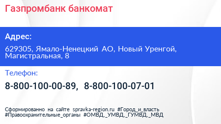 Газпромбанк, банкомат по адресу 629305, Ямало-Ненецкий АО, Новый Уренгой, Магистральная, 8 в дальнейшем Организация, размещена в следующих категориях: