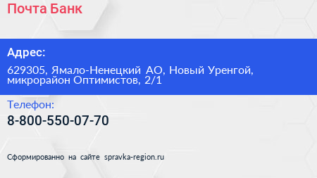 Почта Банк по адресу 629305, Ямало-Ненецкий АО, Новый Уренгой, микрорайон Оптимистов, 2/1 в дальнейшем Организация, размещена в следующих категориях:
