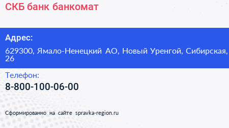 СКБ-банк, банкомат по адресу 629300, Ямало-Ненецкий АО, Новый Уренгой, Сибирская, 26 в дальнейшем Организация, размещена в следующих категориях: