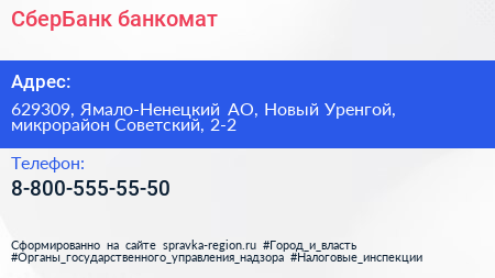 СберБанк, банкомат по адресу 629309, Ямало-Ненецкий АО, Новый Уренгой, микрорайон Советский, 2-2 в дальнейшем Организация, размещена в следующих категориях: