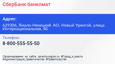 СберБанк, банкомат по адресу 629306, Ямало-Ненецкий АО, Новый Уренгой, улица Интернациональная, 4Б в дальнейшем Организация, размещена в следующих категориях: