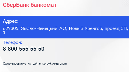 СберБанк, банкомат по адресу 629305, Ямало-Ненецкий АО, Новый Уренгой, проезд 5П, 1 в дальнейшем Организация, размещена в следующих категориях: