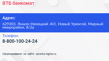 ВТБ, банкомат по адресу 629303, Ямало-Ненецкий АО, Новый Уренгой, Мирный микрорайон, 8/2а в дальнейшем Организация, размещена в следующих категориях: