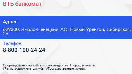 ВТБ, банкомат по адресу 629300, Ямало-Ненецкий АО, Новый Уренгой, Сибирская, 26 в дальнейшем Организация, размещена в следующих категориях: