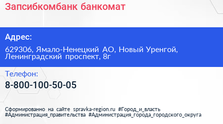 Запсибкомбанк, банкомат по адресу 629306, Ямало-Ненецкий АО, Новый Уренгой, Ленинградский проспект, 8г в дальнейшем Организация, размещена в следующих категориях: