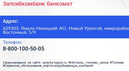 Запсибкомбанк, банкомат по адресу 629303, Ямало-Ненецкий АО, Новый Уренгой, микрорайон Восточный, 5/9 в дальнейшем Организация, размещена в следующих категориях: