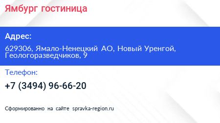 Ямбург, гостиница по адресу 629306, Ямало-Ненецкий АО, Новый Уренгой, Геологоразведчиков, 9 в дальнейшем Организация, размещена в следующих категориях: