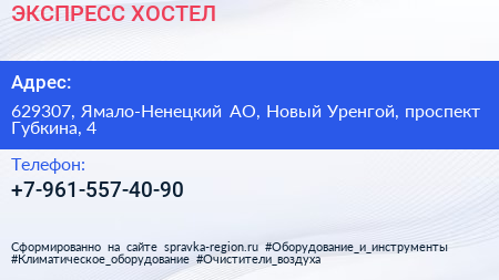 ЭКСПРЕСС ХОСТЕЛ по адресу 629307, Ямало-Ненецкий АО, Новый Уренгой, проспект Губкина, 4 в дальнейшем Организация, размещена в следующих категориях: