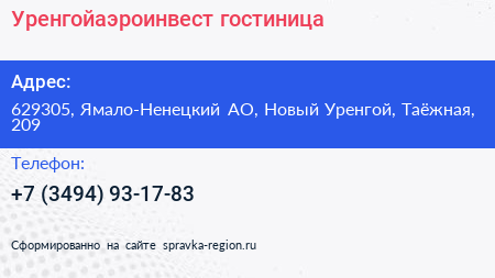 Уренгойаэроинвест, гостиница по адресу 629305, Ямало-Ненецкий АО, Новый Уренгой, Таёжная, 209 в дальнейшем Организация, размещена в следующих категориях: