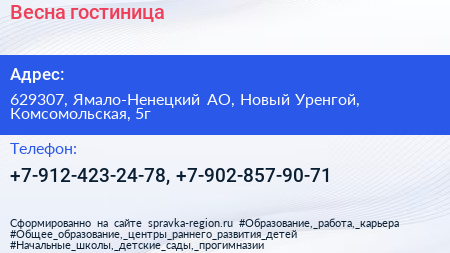 Весна, гостиница по адресу 629307, Ямало-Ненецкий АО, Новый Уренгой, Комсомольская, 5г в дальнейшем Организация, размещена в следующих категориях: