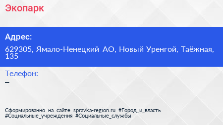 Экопарк по адресу 629305, Ямало-Ненецкий АО, Новый Уренгой, Таёжная, 135 в дальнейшем Организация, размещена в следующих категориях: