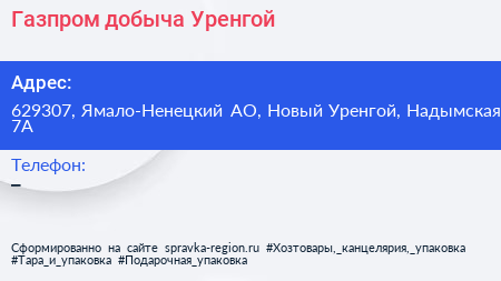 Газпром добыча Уренгой по адресу 629307, Ямало-Ненецкий АО, Новый Уренгой, Надымская, 7А в дальнейшем Организация, размещена в следующих категориях: