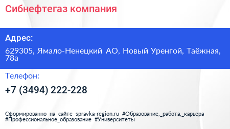 Сибнефтегаз, компания по адресу 629305, Ямало-Ненецкий АО, Новый Уренгой, Таёжная, 78а в дальнейшем Организация, размещена в следующих категориях: