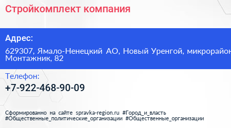 Стройкомплект, компания по адресу 629307, Ямало-Ненецкий АО, Новый Уренгой, микрорайон Монтажник, 82 в дальнейшем Организация, размещена в следующих категориях: