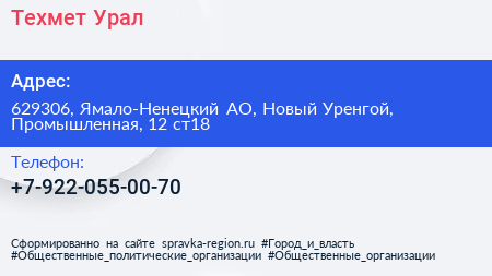 Техмет-Урал по адресу 629306, Ямало-Ненецкий АО, Новый Уренгой, Промышленная, 12 ст18 в дальнейшем Организация, размещена в следующих категориях: