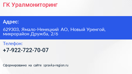 ГК Уралмониторинг по адресу 629303, Ямало-Ненецкий АО, Новый Уренгой, микрорайон Дружба, 2/6 в дальнейшем Организация, размещена в следующих категориях: