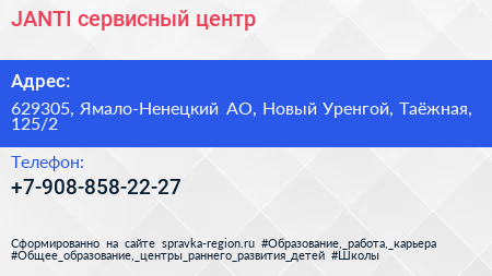 JANTI, сервисный центр по адресу 629305, Ямало-Ненецкий АО, Новый Уренгой, Таёжная, 125/2 в дальнейшем Организация, размещена в следующих категориях:
