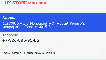 LUX STORE, магазин по адресу 629309, Ямало-Ненецкий АО, Новый Уренгой, микрорайон Советский, 5-3 в дальнейшем Организация, размещена в следующих категориях: