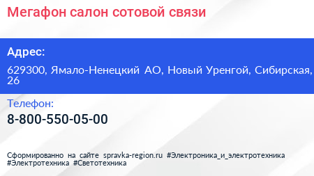 Мегафон, салон сотовой связи по адресу 629300, Ямало-Ненецкий АО, Новый Уренгой, Сибирская, 26 в дальнейшем Организация, размещена в следующих категориях: