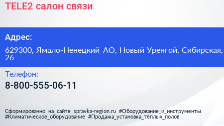 TELE2, салон связи по адресу 629300, Ямало-Ненецкий АО, Новый Уренгой, Сибирская, 26 в дальнейшем Организация, размещена в следующих категориях: