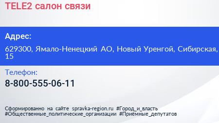 TELE2, салон связи по адресу 629300, Ямало-Ненецкий АО, Новый Уренгой, Сибирская, 15 в дальнейшем Организация, размещена в следующих категориях: